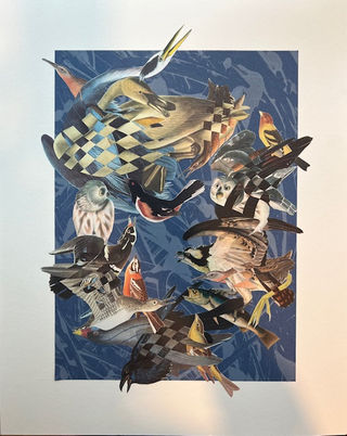The Metatorus work started with jewelry and assembláge pieces made from re-purposed bicycle inner-tubes, but after finding a 1941 edition of Audubon’s The Birds of America her creative energy shifted towards analog collages. She has been experimenting with cutting and weaving the vintage Audubon prints for several years and from this, the BirdCrash series emerged.